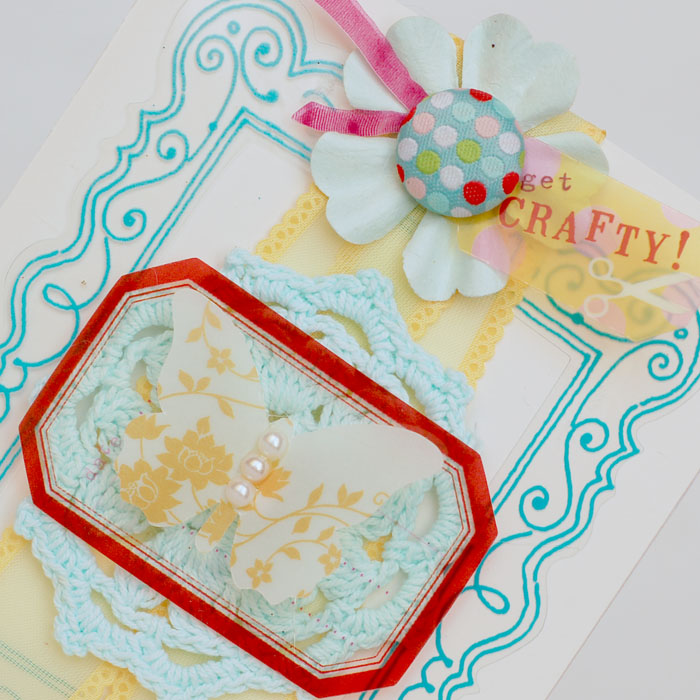And check out the heart shape Thread! I mounted it on paper and embellished it with a new chipboard button and some rosettes.